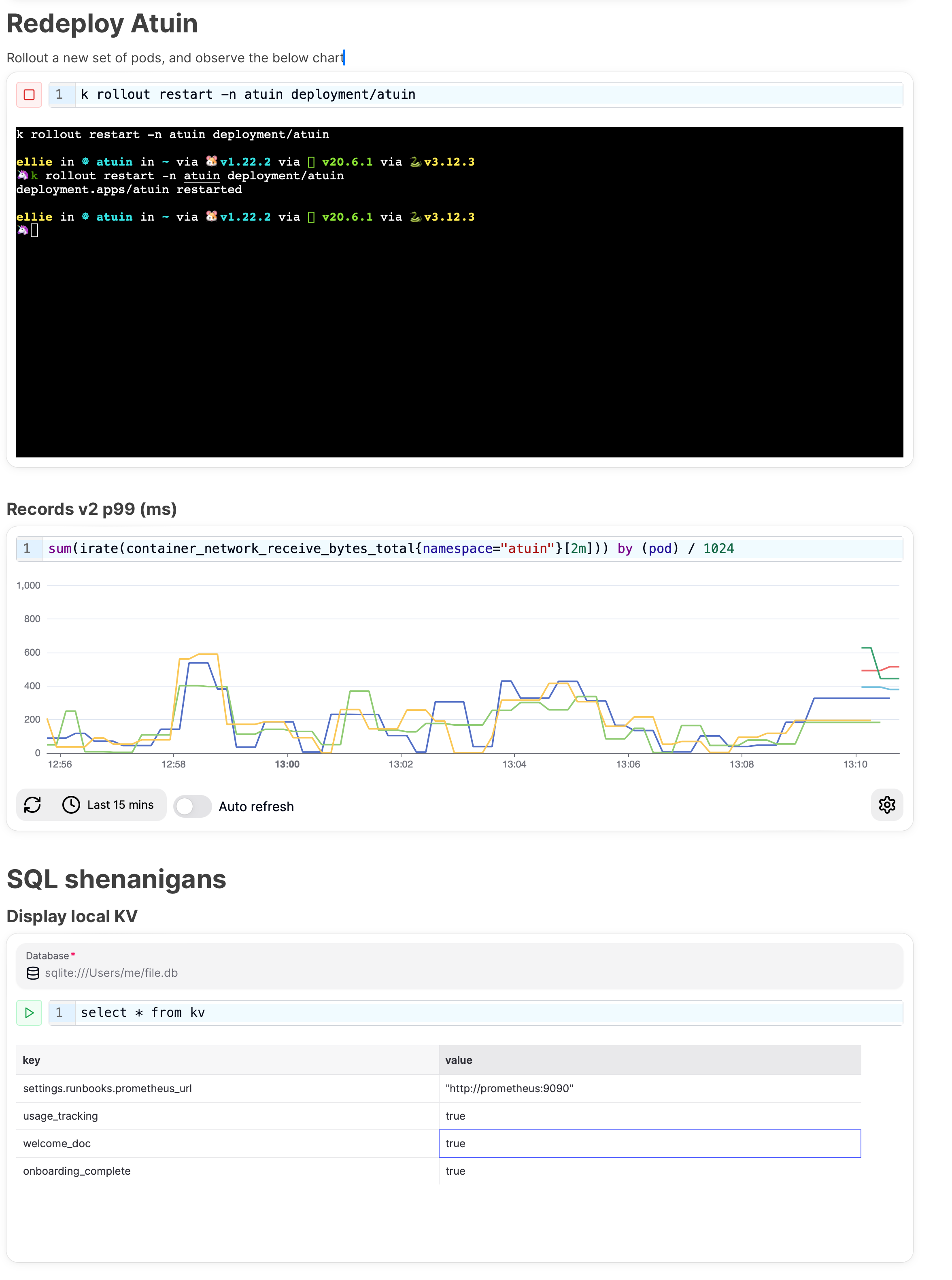 - Executable Runbooks: Atuin Desktop combines the functionality of a document with the power of a terminal. It allows you to create runbooks that include script blocks, embedded terminals, database clients, and Prometheus charts—all in one place.